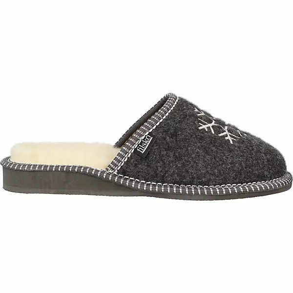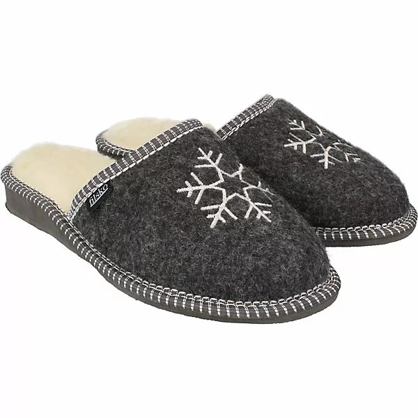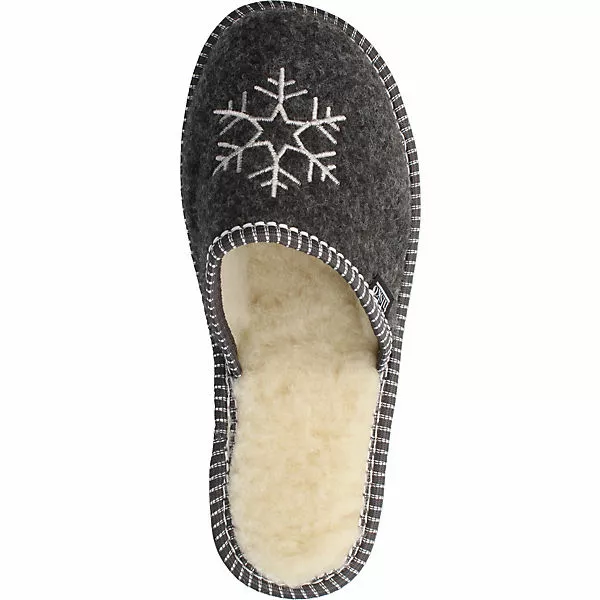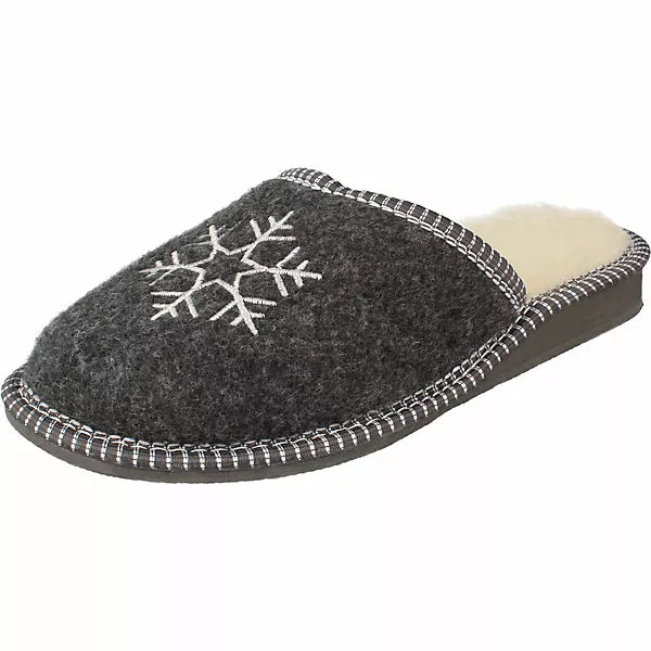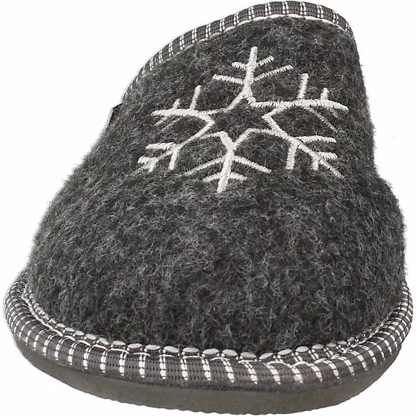 – Schick: Der Hausschuh ist halboffen und besitzt auf dem grauen Obermaterial aus Filz, ein winterliches Motiv. Die weiße gestreifte Naht verleiht dem Schuh das gewisse Etwas.