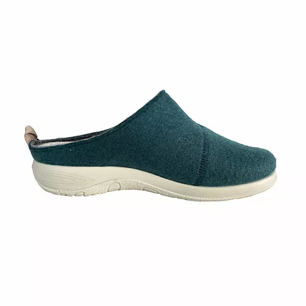 Obermaterial: Softfilz Innenmaterial: Softfilz Decksohle: Textil, Wechselfußbett Sonstiges: für lose Einlagen geeignet Passform: normal Absatz: Keil ca. 2,5 cm Sohle: PU-Laufsohle Verschluss: Schlupf Art. Nr.: 864101 Farbe: PETROLIO GRÜN