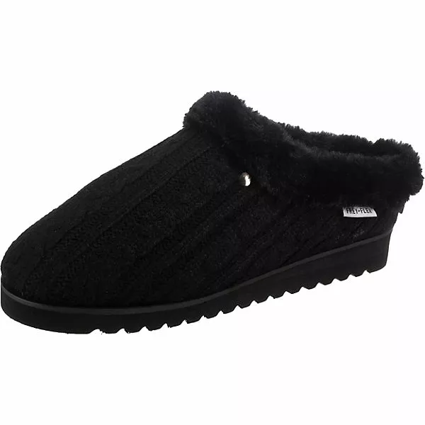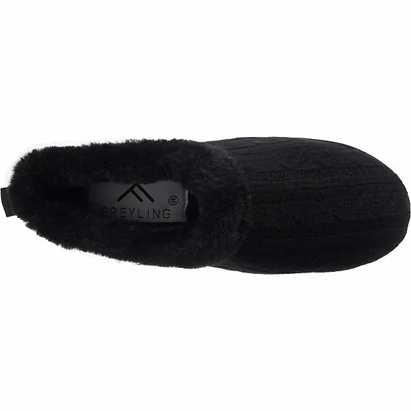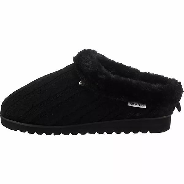 Für ein gemütliches Tragegefühl: Die Pantoffeln der Marke Freyling. Aufgrund des Warmfutters ist dieses Paar optimal für kühles Wetter geschaffen. Das textile Obermaterial ist anschmiegsam und hat ein geringes Gewicht. Der Keilabsatz kombiniert einen modischen Look mit angenehmem Tragekomfort. Dieses Modell kommt ohne Verschluss aus, sodass ganz einfach hineingeschlüpft werden kann.