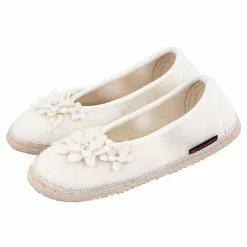 Entdecke diese stilvollen Hausschuhe im Ballerina-Style! Die blumigen, hochwertigen Applikationen sorgen für den extra Chic Zuhause! Die kuschelweiche Wolle und die flexible Naturkauschuksohle formvollenden diesen hochwertigen Premium-Hausschuh.