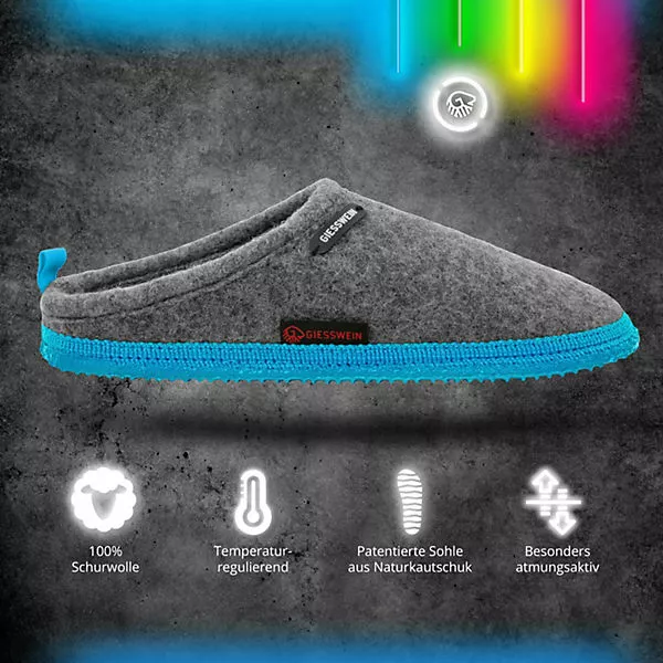 Achtung – nicht reinbeißen! Die mit Lebensmittelfarbe gefärbten Sohlen der WOOL POPS aktivieren nicht nur deinen Komfort, sondern auch deine gute Laune – und machen Appetit auf GIESSWEIN-Qualität! Die besonders beliebten Pantoffeln aus 100 % Schurwolle sorgen seit Jahren für gute Stimmung und überzeugen mit Qualität und positiver Energie. Die rutschfeste Kautschuksohle als leuchtender Farbakzent sorgt für Style und Spaß zu jeder Tageszeit und verleiht den Qualitätspantoffeln einen poppigen Look. Ob blau, gelb, grün oder pink kombiniert mit GIESSWEIN-Premium-Wollstoffen in meliertem hellgrau oder anthrazit – dein perfekter Mix ist auf jeden Fall dabei! Wähle jetzt deinen Gute-Laune-Garanten für zu Hause!