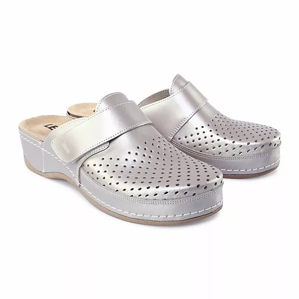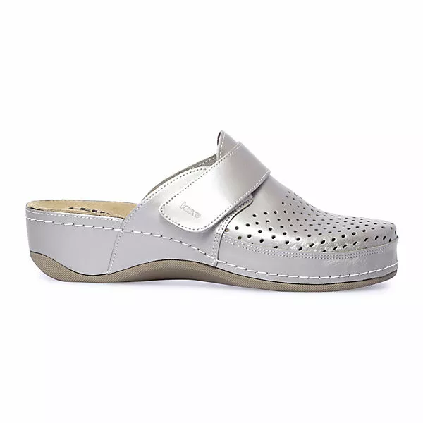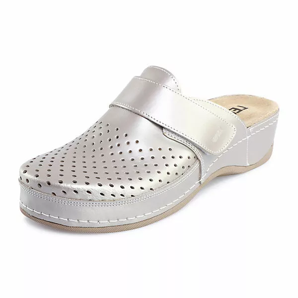 Amita, die komfortable Pantolette für Sie aus unserer Mecial Serie. Das perforierte Oberteil aus extrem angenehmem Lederobermaterial und Futter sorgt für höchsten Targekomfort und Atmungsaktivität. Eine zeitlose schöne Pantolette, sowohl für innen als auch für draußen. Das weich gepolsterte Fußbett in Verbindung mit der langlebigen und dämpfenden PU-Sohle sorgen für den größtmöglichen Tragekomfort. Der verstellbare Klettverschluss sorgt dafür, dass sich der Schuh an jede Fußform optimal anpassen lässt. Zusätzlich macht die mit Leder überzogene Zwischensohle Amita zu einem echten Hingucker. Komfort „Made in Europe“