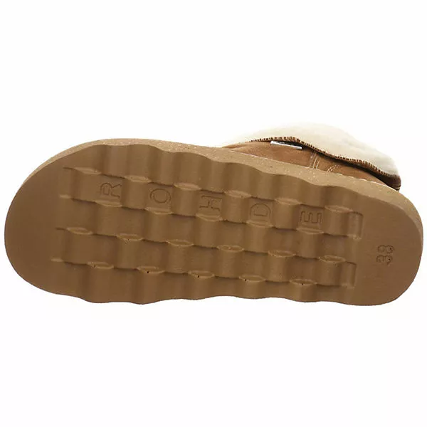 Kuscheliger Damenhausschuh der Qualitätsmarke Rohde in modischem Cognac mit Fellüberschlag. Eine trendige Plateausohle mit Wellen sorgt dabei für einen stylischen Look. Behalten Sie auch an kalten Tagen warme Füße mit diesem tollen Hausschuh.