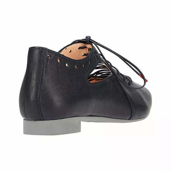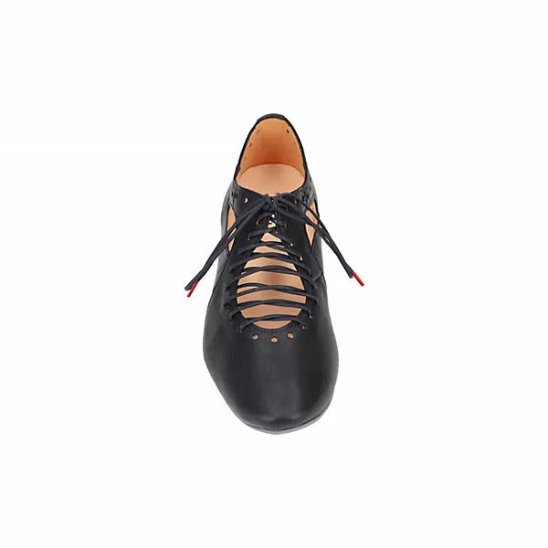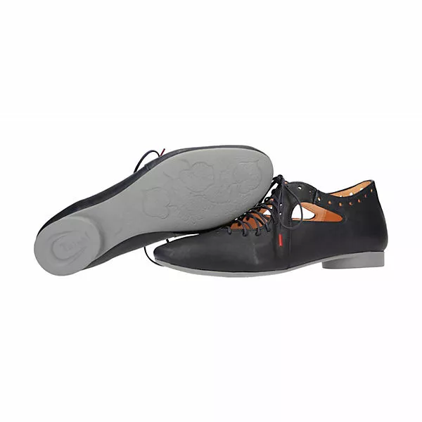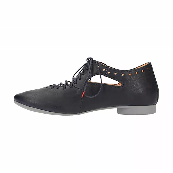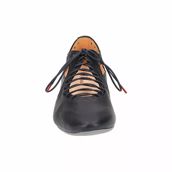 Hersteller: Think Hersteller Art-Nr.: 4-84939-87 Modellname: GUAD Machart: Damenschuhe – elegante Schnür- Halbschuhe Farbe: dunkel-blau + Sohle in grau (navy) Obermaterial: Echtleder – Glattleder (Wax Nappa Veg.) Innenfutter: Echtleder – naturgegerbt Innensohle: Echtleder Komfort Fußbett Wechselfußbett: Ja – herausnehmbare Innensohle Laufsohle: Latex Verschluss: 9fach Schnürung Absatzart: Blockabsatz Absatzhöhe: kleiner Absatz, ca. 1,5cm Schuhform: rund Größenhinweis: fällt normal aus Weitenangabe: G – normal Weite